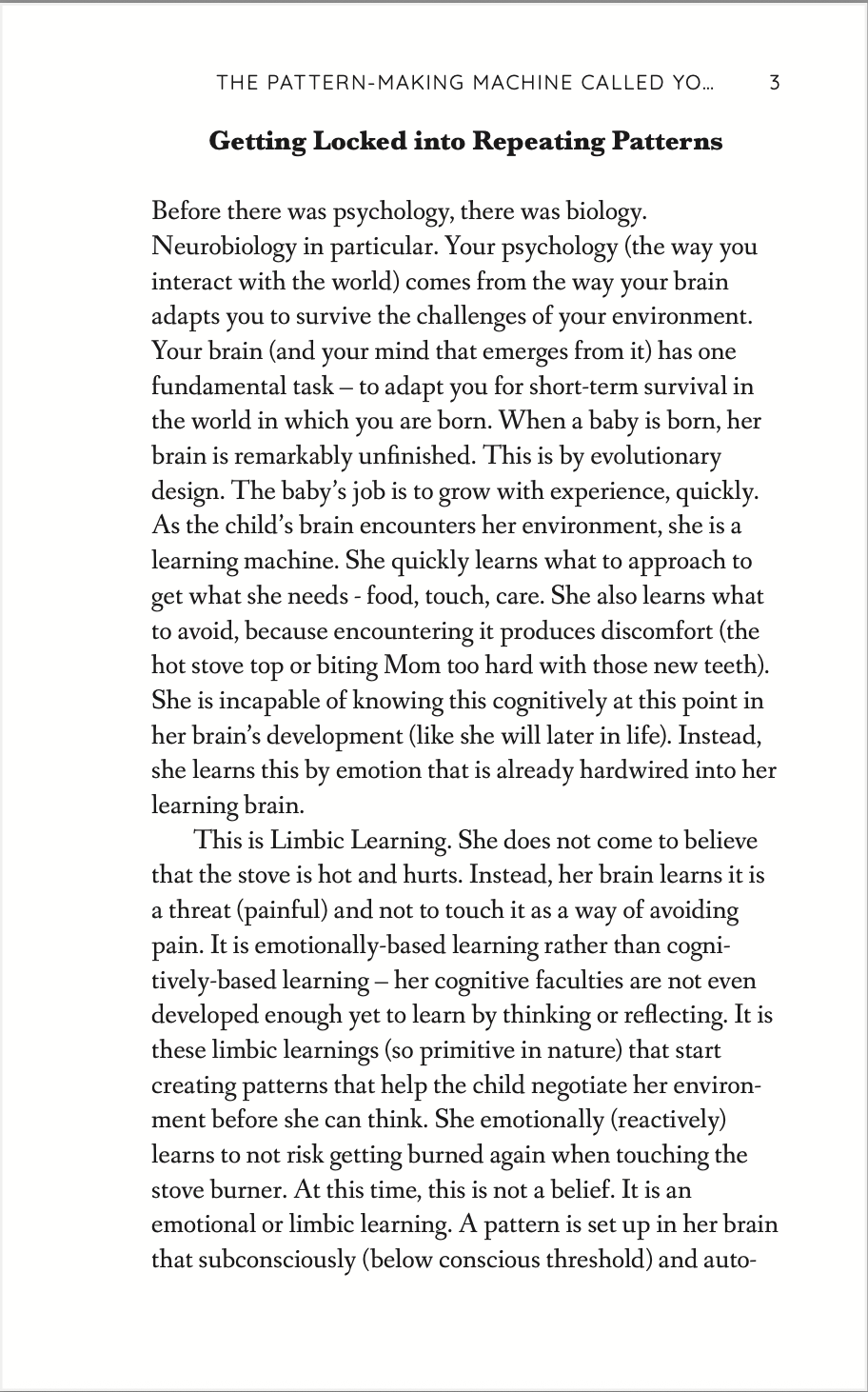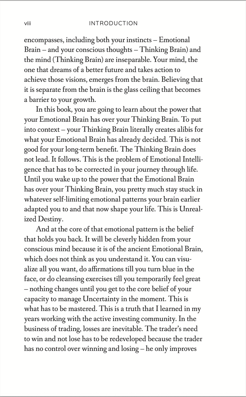 Howell combines his experience in psychology and counseling financial traders to offer solid and proven techniques for realizing one's potential by overcoming self defeating emotional patterns learned during our childhood. Howell makes these profound insights very accessible in a fast read with no fluff. I can not over emphasize the importance of this book.